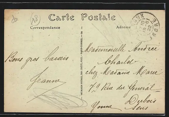 Personenbezogene Daten auf der Rückseite der Karte wurden durch blauen Textmarker unkenntlich gemacht. Die blauen Stellen sind auf die Vorderseite durchgeweicht und wirken sich negativ auf das Postkartenfoto aus