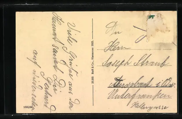Personenbezogene Daten auf der Rückseite der Karte wurden durch blauen Textmarker unkenntlich gemacht. Die blauen Stellen sind auf die Vorderseite durchgeweicht und wirken sich negativ auf das Postkartenfoto aus