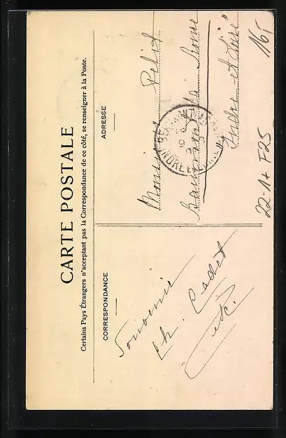 Personenbezogene Daten auf der Rückseite der Karte wurden durch blauen Textmarker unkenntlich gemacht. Die blauen Stellen sind auf die Vorderseite durchgeweicht und wirken sich negativ auf das Postkartenfoto aus