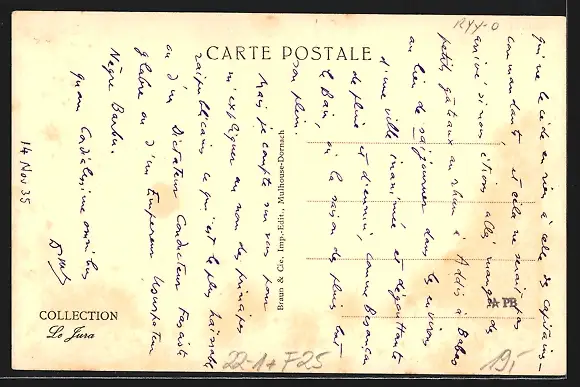 Personenbezogene Daten auf der Rückseite der Karte wurden durch blauen Textmarker unkenntlich gemacht. Die blauen Stellen sind auf die Vorderseite durchgeweicht und wirken sich negativ auf das Postkartenfoto aus