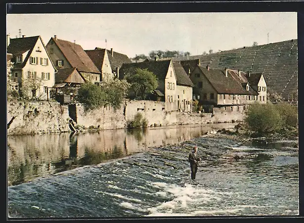 AK Besigheim a. Neckar, Uferpartie mit Angler