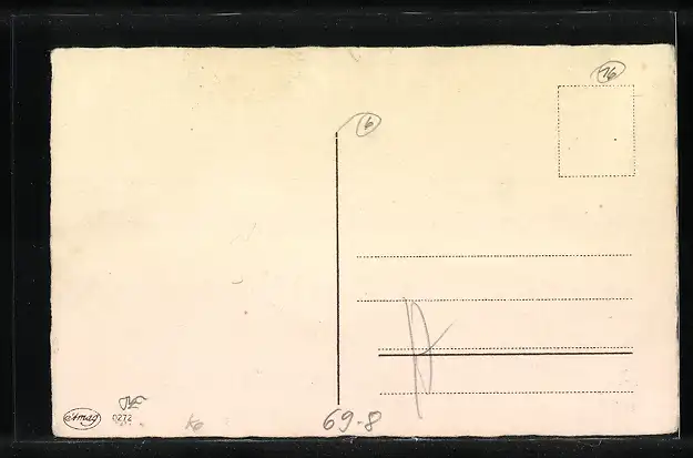 Personenbezogene Daten auf der Rückseite der Karte wurden durch blauen Textmarker unkenntlich gemacht. Die blauen Stellen sind auf die Vorderseite durchgeweicht und wirken sich negativ auf das Postkartenfoto aus