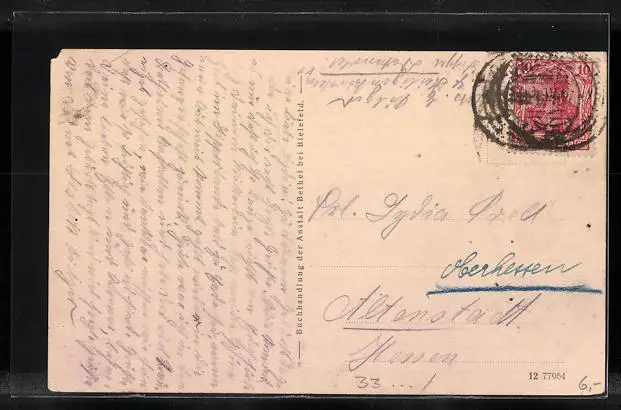 Personenbezogene Daten auf der Rückseite der Karte wurden durch blauen Textmarker unkenntlich gemacht. Die blauen Stellen sind auf die Vorderseite durchgeweicht und wirken sich negativ auf das Postkartenfoto aus