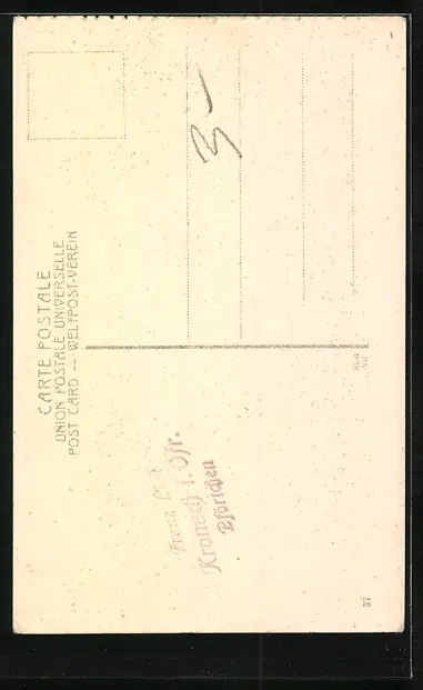 Personenbezogene Daten auf der Rückseite der Karte wurden durch blauen Textmarker unkenntlich gemacht. Die blauen Stellen sind auf die Vorderseite durchgeweicht und wirken sich negativ auf das Postkartenfoto aus