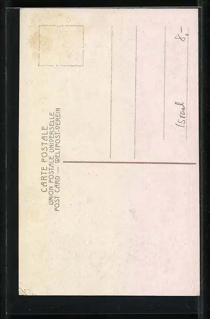 Personenbezogene Daten auf der Rückseite der Karte wurden durch blauen Textmarker unkenntlich gemacht. Die blauen Stellen sind auf die Vorderseite durchgeweicht und wirken sich negativ auf das Postkartenfoto aus