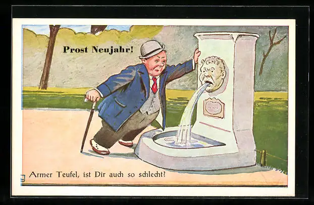 AK Betrunkener redet mit speiendem Brunnenkopf, Neujahrsgruss