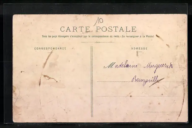 Personenbezogene Daten auf der Rückseite der Karte wurden durch blauen Textmarker unkenntlich gemacht. Die blauen Stellen sind auf die Vorderseite durchgeweicht und wirken sich negativ auf das Postkartenfoto aus