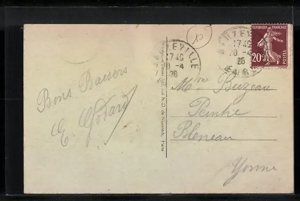 Personenbezogene Daten auf der Rückseite der Karte wurden durch blauen Textmarker unkenntlich gemacht. Die blauen Stellen sind auf die Vorderseite durchgeweicht und wirken sich negativ auf das Postkartenfoto aus