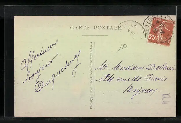 Personenbezogene Daten auf der Rückseite der Karte wurden durch blauen Textmarker unkenntlich gemacht. Die blauen Stellen sind auf die Vorderseite durchgeweicht und wirken sich negativ auf das Postkartenfoto aus