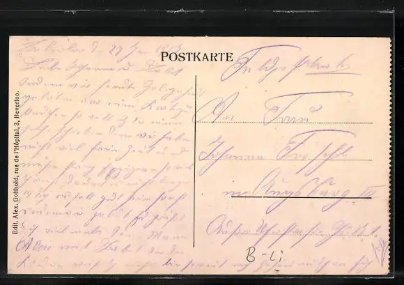 Personenbezogene Daten auf der Rückseite der Karte wurden durch blauen Textmarker unkenntlich gemacht. Die blauen Stellen sind auf die Vorderseite durchgeweicht und wirken sich negativ auf das Postkartenfoto aus