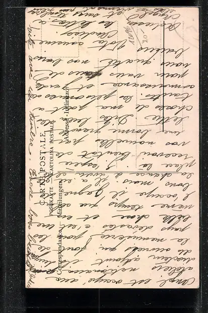 Personenbezogene Daten auf der Rückseite der Karte wurden durch blauen Textmarker unkenntlich gemacht. Die blauen Stellen sind auf die Vorderseite durchgeweicht und wirken sich negativ auf das Postkartenfoto aus