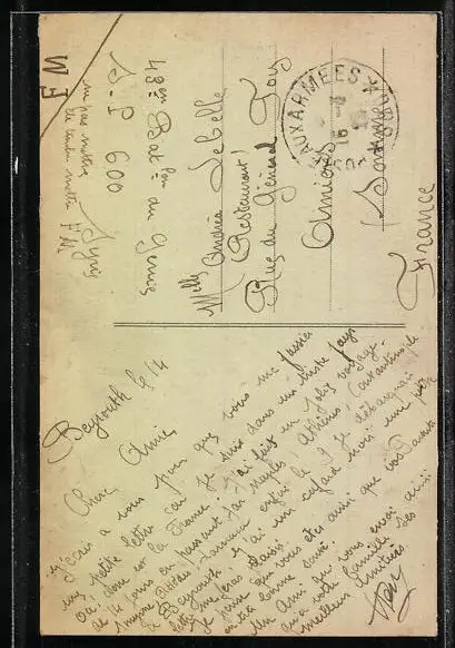 Personenbezogene Daten auf der Rückseite der Karte wurden durch blauen Textmarker unkenntlich gemacht. Die blauen Stellen sind auf die Vorderseite durchgeweicht und wirken sich negativ auf das Postkartenfoto aus