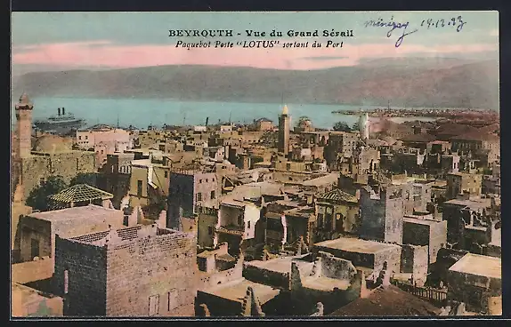 AK Beyrouth, Vue du Grand Sérail, Paquebot Poste Lotus sortant du Port