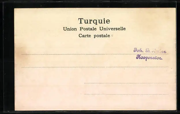 Personenbezogene Daten auf der Rückseite der Karte wurden durch blauen Textmarker unkenntlich gemacht. Die blauen Stellen sind auf die Vorderseite durchgeweicht und wirken sich negativ auf das Postkartenfoto aus