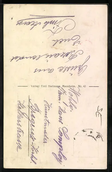 Personenbezogene Daten auf der Rückseite der Karte wurden durch blauen Textmarker unkenntlich gemacht. Die blauen Stellen sind auf die Vorderseite durchgeweicht und wirken sich negativ auf das Postkartenfoto aus
