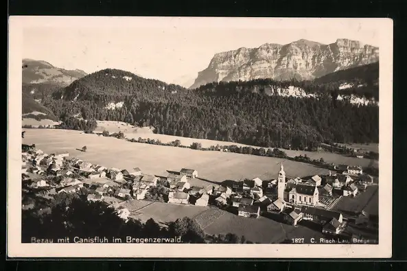 AK Bezau, Ortsansicht aus der Vogelschau bei Sonnenschein