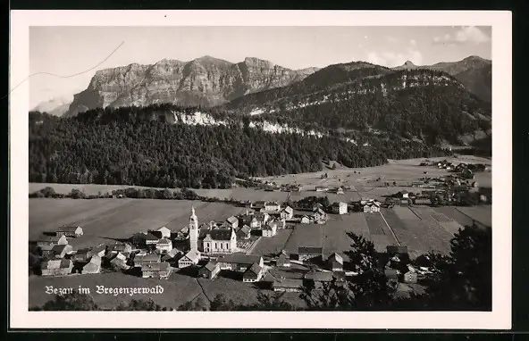 AK Bezau, Totalansicht aus der Vogelschau mit Bergkette