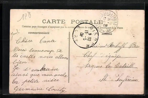 gelaufen 1908, Eckknick oben li., guter Zustand