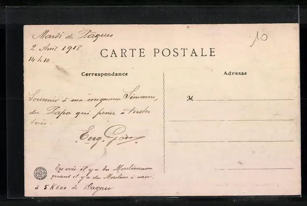 Personenbezogene Daten auf der Rückseite der Karte wurden durch blauen Textmarker unkenntlich gemacht. Die blauen Stellen sind auf die Vorderseite durchgeweicht und wirken sich negativ auf das Postkartenfoto aus
