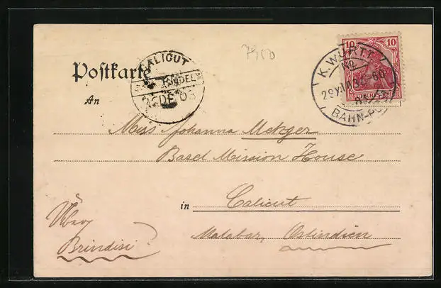 Personenbezogene Daten auf der Rückseite der Karte wurden durch blauen Textmarker unkenntlich gemacht. Die blauen Stellen sind auf die Vorderseite durchgeweicht und wirken sich negativ auf das Postkartenfoto aus