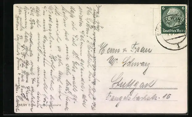 Personenbezogene Daten auf der Rückseite der Karte wurden durch blauen Textmarker unkenntlich gemacht. Die blauen Stellen sind auf die Vorderseite durchgeweicht und wirken sich negativ auf das Postkartenfoto aus