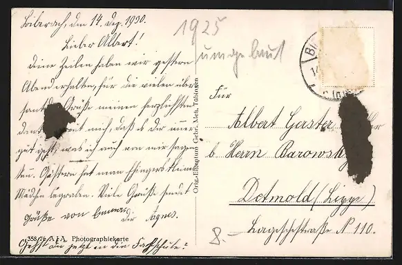 Personenbezogene Daten auf der Rückseite der Karte wurden durch blauen Textmarker unkenntlich gemacht. Die blauen Stellen sind auf die Vorderseite durchgeweicht und wirken sich negativ auf das Postkartenfoto aus