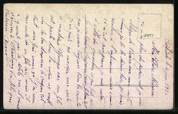Personenbezogene Daten auf der Rückseite der Karte wurden durch blauen Textmarker unkenntlich gemacht. Die blauen Stellen sind auf die Vorderseite durchgeweicht und wirken sich negativ auf das Postkartenfoto aus