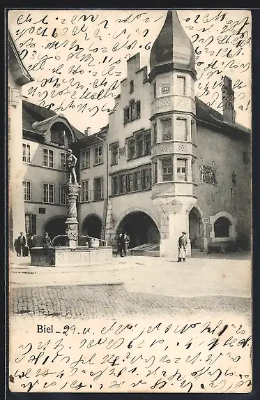 AK Biel, Strassenpartie mit Brunnen