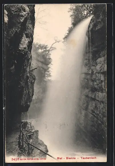 AK Biel, Taubenloch, Wasserfall mit Uferweg