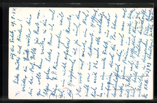 Personenbezogene Daten auf der Rückseite der Karte wurden durch blauen Textmarker unkenntlich gemacht. Die blauen Stellen sind auf die Vorderseite durchgeweicht und wirken sich negativ auf das Postkartenfoto aus