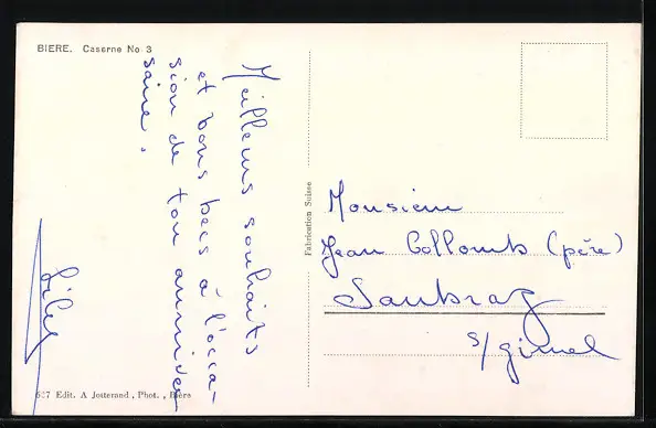 Personenbezogene Daten auf der Rückseite der Karte wurden durch blauen Textmarker unkenntlich gemacht. Die blauen Stellen sind auf die Vorderseite durchgeweicht und wirken sich negativ auf das Postkartenfoto aus