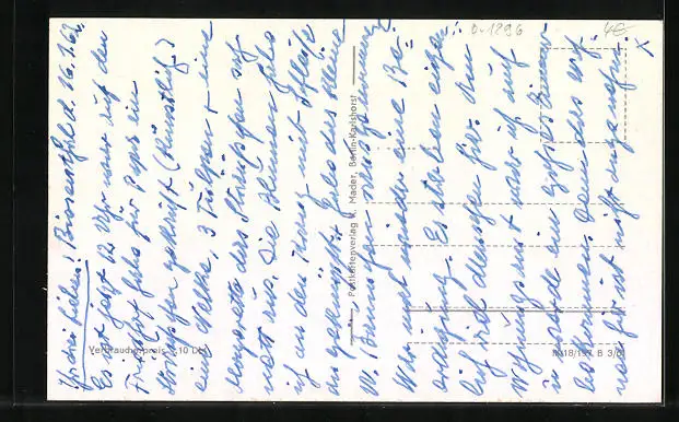 Personenbezogene Daten auf der Rückseite der Karte wurden durch blauen Textmarker unkenntlich gemacht. Die blauen Stellen sind auf die Vorderseite durchgeweicht und wirken sich negativ auf das Postkartenfoto aus