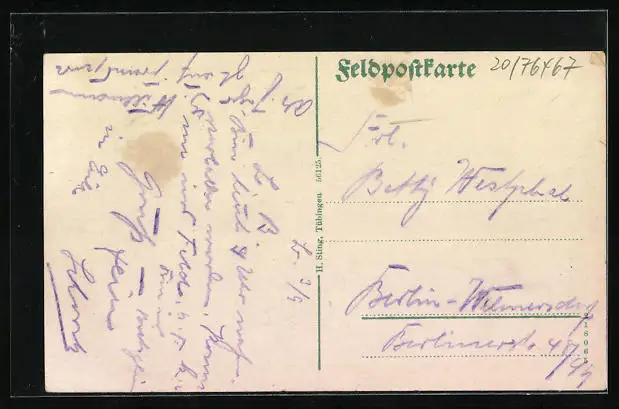 Personenbezogene Daten auf der Rückseite der Karte wurden durch blauen Textmarker unkenntlich gemacht. Die blauen Stellen sind auf die Vorderseite durchgeweicht und wirken sich negativ auf das Postkartenfoto aus