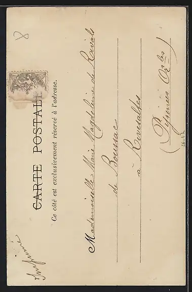 Personenbezogene Daten auf der Rückseite der Karte wurden durch blauen Textmarker unkenntlich gemacht. Die blauen Stellen sind auf die Vorderseite durchgeweicht und wirken sich negativ auf das Postkartenfoto aus
