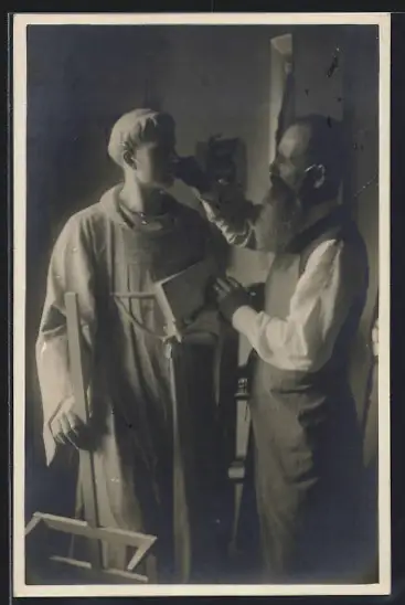 AK Bildhauer und Kunstschnitzer arbeitet konzentriert an einer Skulptur