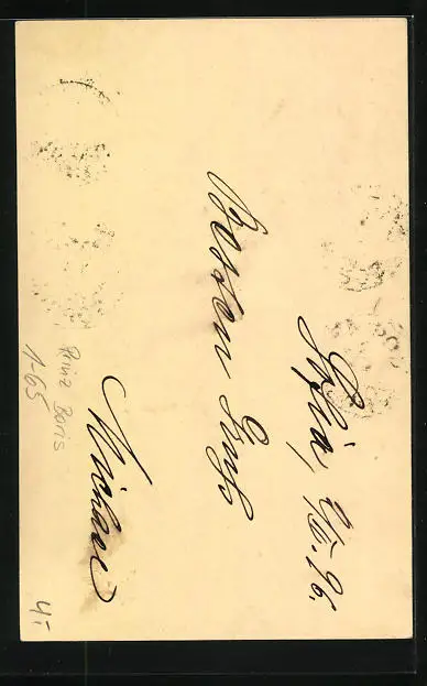 Personenbezogene Daten auf der Rückseite der Karte wurden durch blauen Textmarker unkenntlich gemacht. Die blauen Stellen sind auf die Vorderseite durchgeweicht und wirken sich negativ auf das Postkartenfoto aus