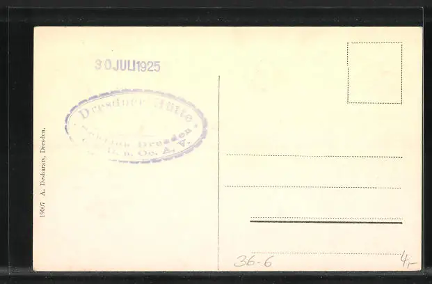 Personenbezogene Daten auf der Rückseite der Karte wurden durch blauen Textmarker unkenntlich gemacht. Die blauen Stellen sind auf die Vorderseite durchgeweicht und wirken sich negativ auf das Postkartenfoto aus