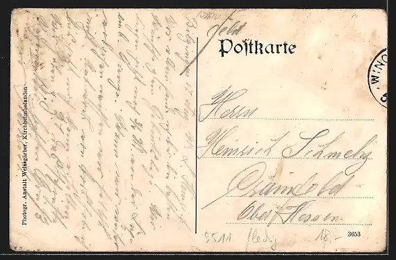 Personenbezogene Daten auf der Rückseite der Karte wurden durch blauen Textmarker unkenntlich gemacht. Die blauen Stellen sind auf die Vorderseite durchgeweicht und wirken sich negativ auf das Postkartenfoto aus
