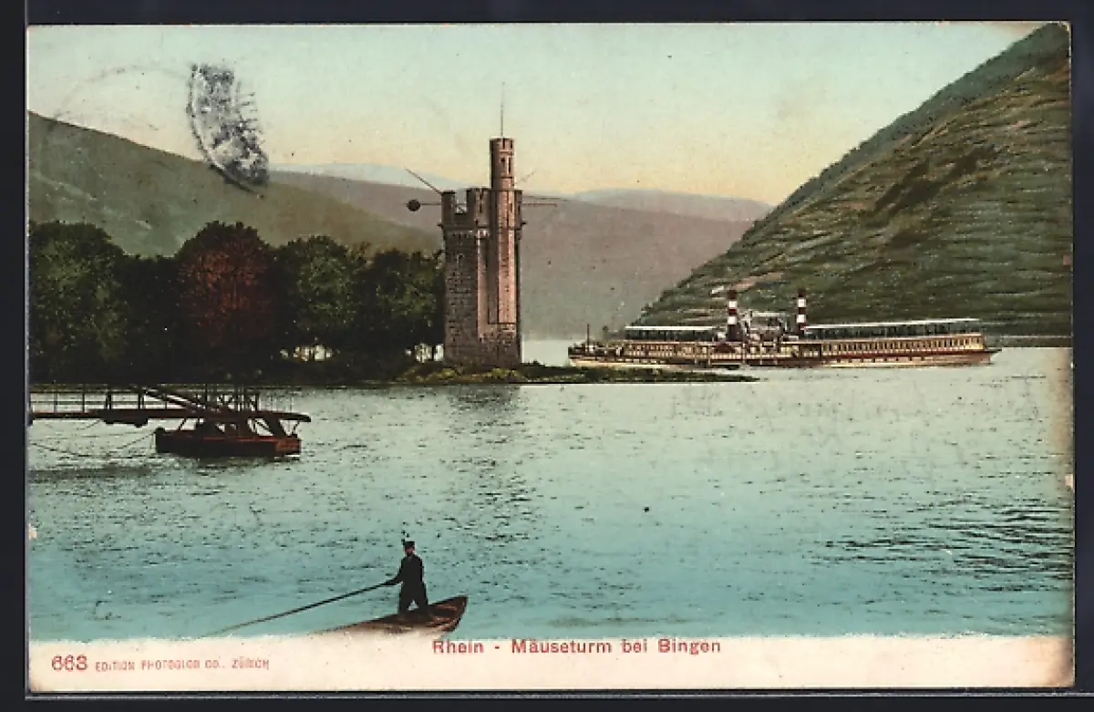 AK Bingen /Rhein, Mäuseturm mit Dampfer