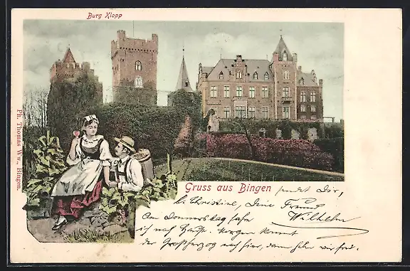 AK Bingen / Rhein, an der Burg Klopp, ein Paar beim Weintrunk