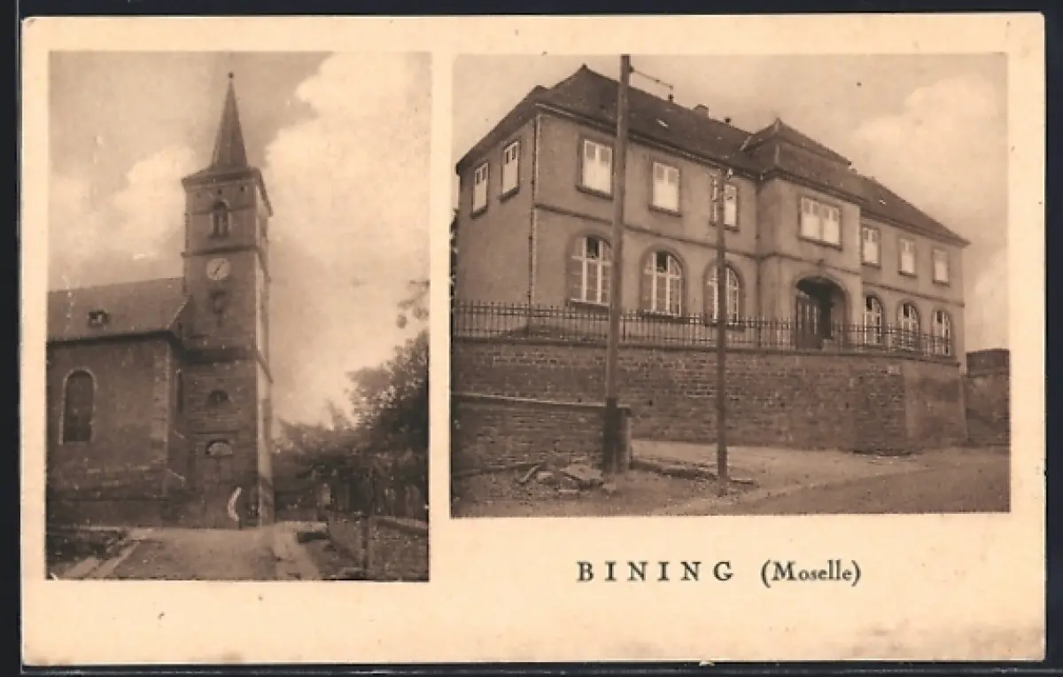 AK Bining /Moselle, Église et bâtiment administratif côte à côte