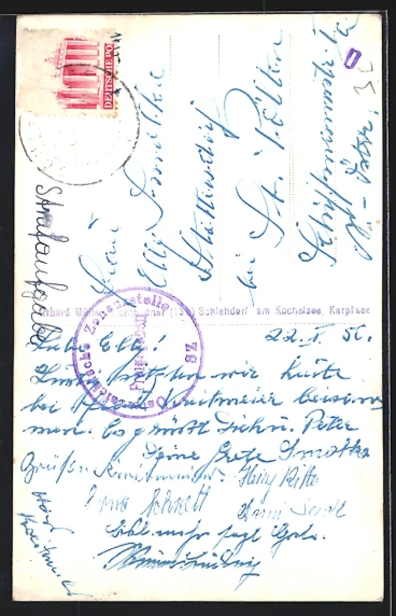 Personenbezogene Daten auf der Rückseite der Karte wurden durch blauen Textmarker unkenntlich gemacht. Die blauen Stellen sind auf die Vorderseite durchgeweicht und wirken sich negativ auf das Postkartenfoto aus