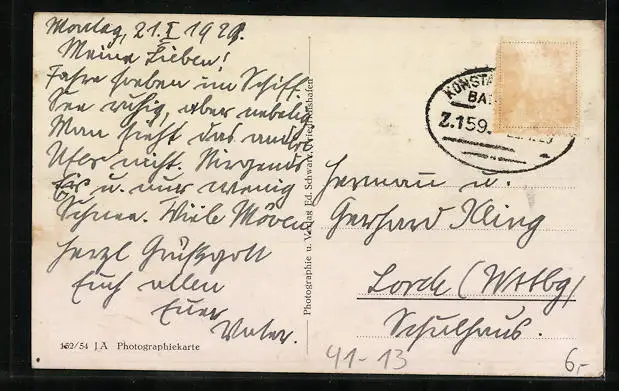 Personenbezogene Daten auf der Rückseite der Karte wurden durch blauen Textmarker unkenntlich gemacht. Die blauen Stellen sind auf die Vorderseite durchgeweicht und wirken sich negativ auf das Postkartenfoto aus