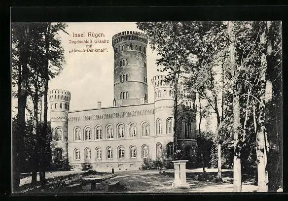 AK Binz / Rügen, Jagdschloss Granitz mit Hirsch-Denkmal