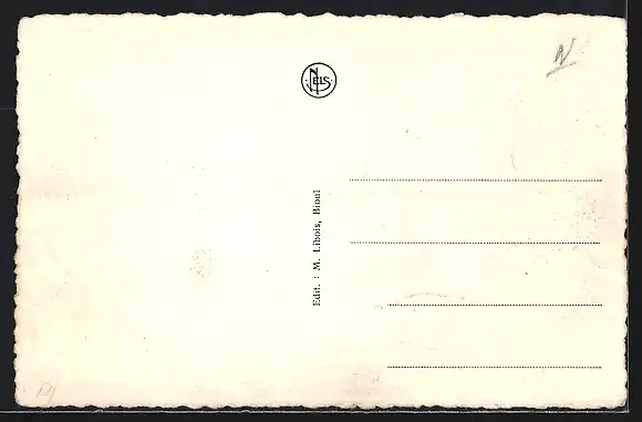 Personenbezogene Daten auf der Rückseite der Karte wurden durch blauen Textmarker unkenntlich gemacht. Die blauen Stellen sind auf die Vorderseite durchgeweicht und wirken sich negativ auf das Postkartenfoto aus