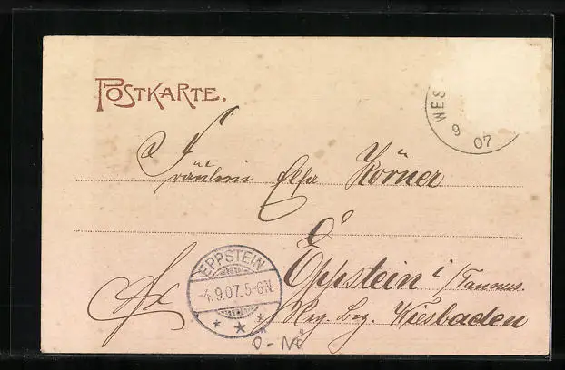 alte Ansichtskarte, gelaufen 1907, Briefmarke entfernt, rückseitig Oberflächenschaden, guter Zustand