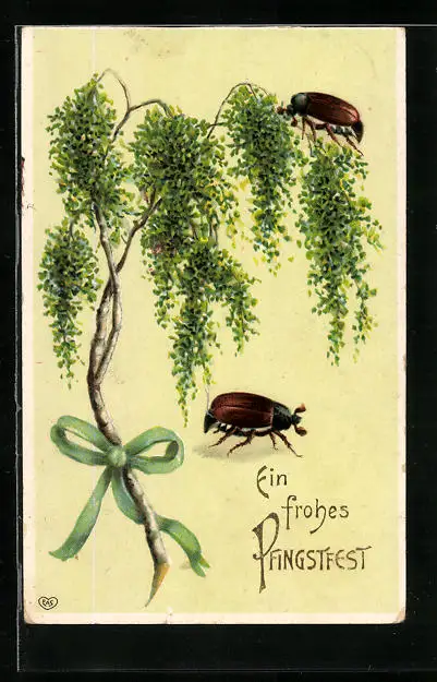 AK Birkenzweig mit Schleife, Maikäfer, Pfingstgruss