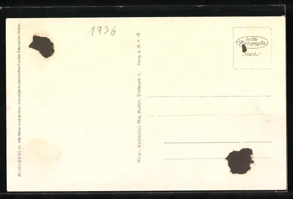 Personenbezogene Daten auf der Rückseite der Karte wurden durch blauen Textmarker unkenntlich gemacht. Die blauen Stellen sind auf die Vorderseite durchgeweicht und wirken sich negativ auf das Postkartenfoto aus