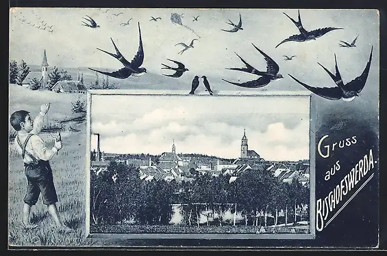 AK Bischofswerda, Stadtansicht, Kind spielt mit Drachen und Vögeln