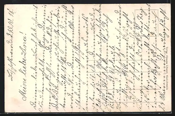Personenbezogene Daten auf der Rückseite der Karte wurden durch blauen Textmarker unkenntlich gemacht. Die blauen Stellen sind auf die Vorderseite durchgeweicht und wirken sich negativ auf das Postkartenfoto aus